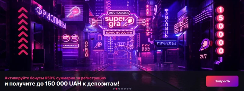 Зі свого боку, новачкам Супер Гра онлайн пропонує скористатися після реєстрації привітальним набором бонусів на перший депозит. Умови отримання бонусу: